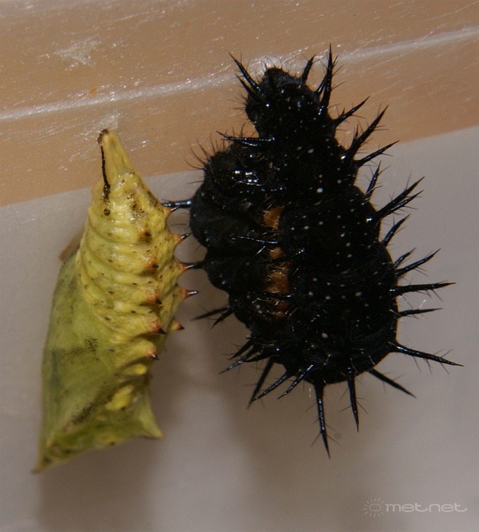 Leírás: Nappali pávaszem friss bábja s bebábozódni készülõ hernyója |