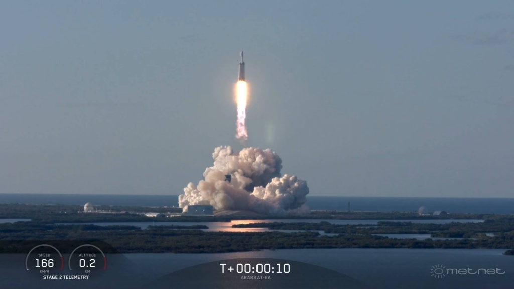 | Leírás: Falcon Heavy fellövése - Első kereskedelmi célból - Arabsat A6 ment Geostacionárius pályára. | |