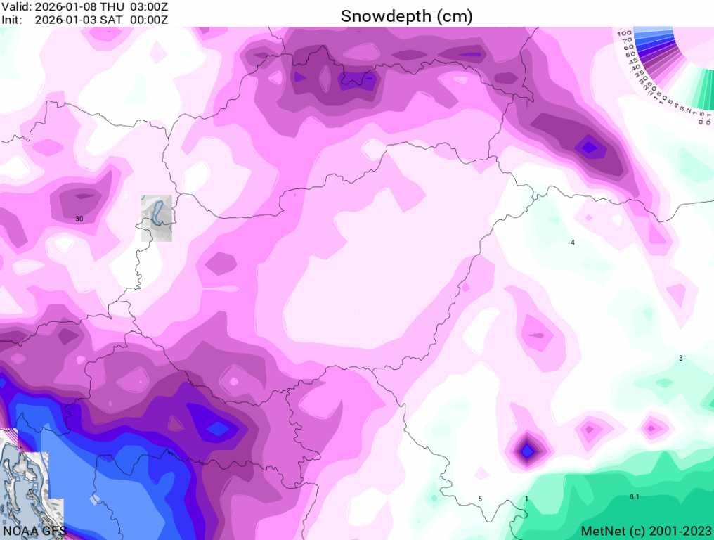 Hétfőn este melegfront érkezik, ami főként északra és keletre hoz csapadékot, zömében havat, de előfordul majd vegyes halmazállapotú csapadék is.