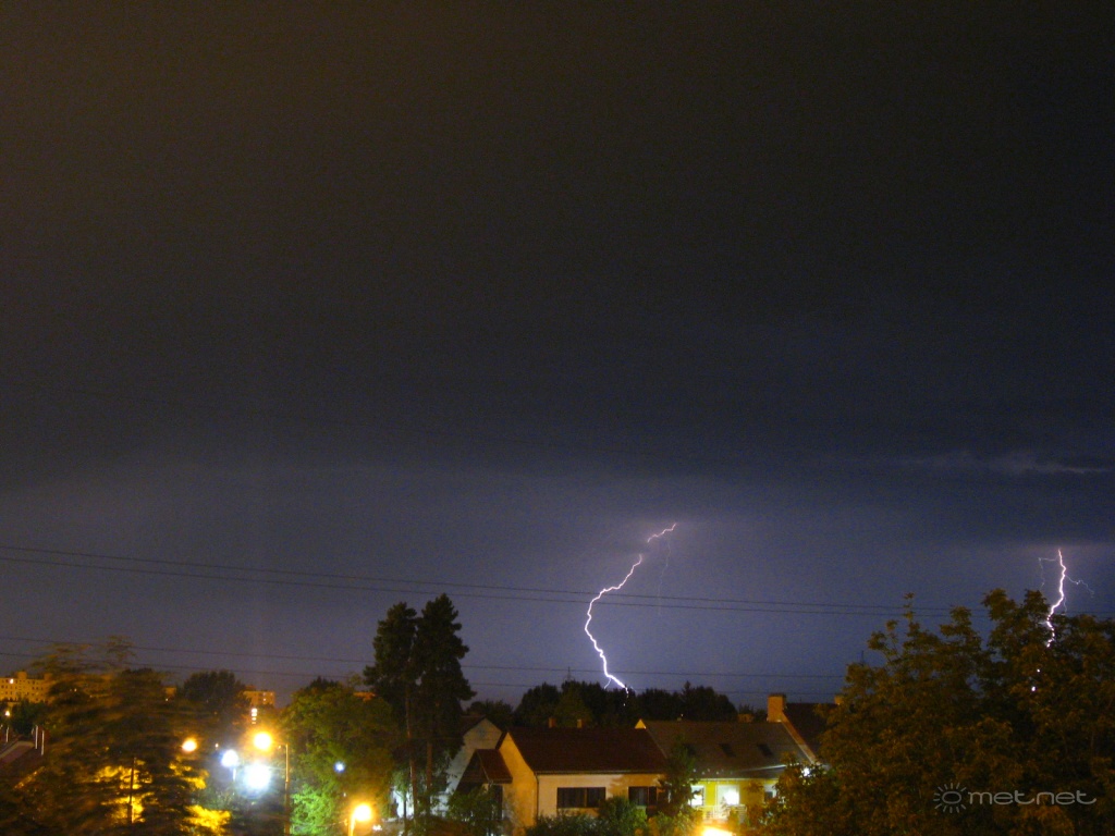 Leírás: A Szegedtõl nyugatra elvonuló zivatar villámai.