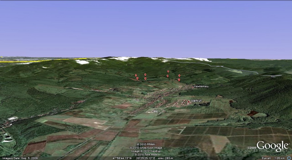 Leírás: Az Eger környéki tornádó feltételezett helyszíne, a megjelölt pontok által határolt területen lehet érdemes kutatást kezdeni. (forrás: Google Earth)