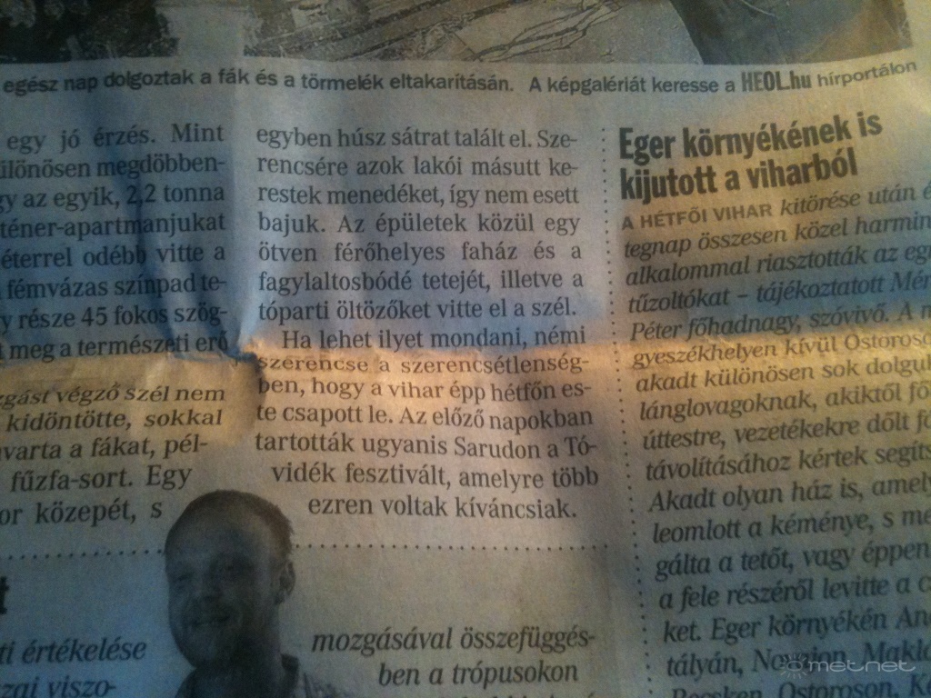 Leírás: Cikkdokumentáció a sarudi tornádóról. Forrás: Heves Megyei Hírlap. Felhasználás célja: tudományos dokumentációs cél