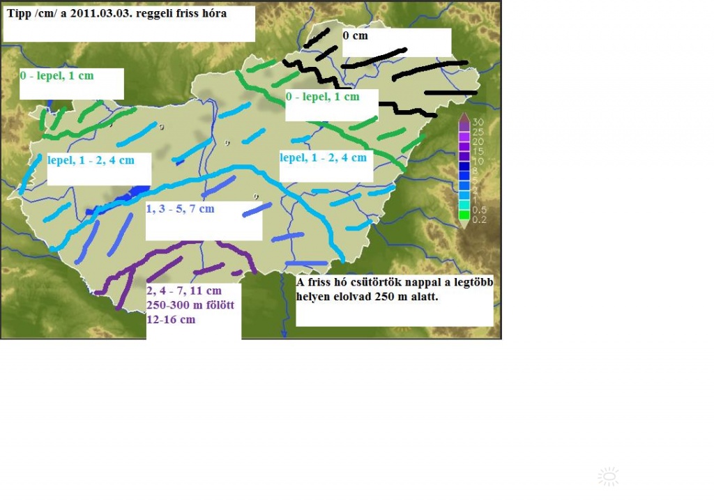 Leírás: Hótipp az érintõ mediterrán ciklon által okozott havazására. Az intervallumokban szereplõ sok szám a biznytalanságot próbálja kifejezni. A vonalak csak hozzávetõleges vonalak, ezektõl a valóság el fog térni, mint ahogy a tippelt cm-tõl is.:) A silány grafikai minõségért elnézést kérek!