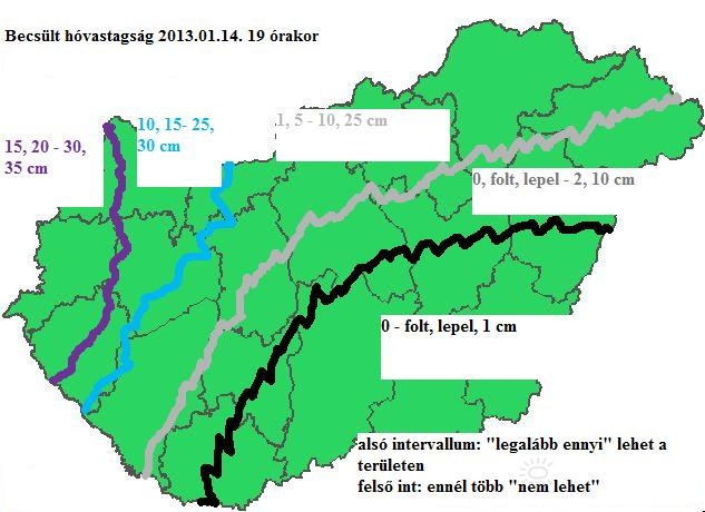Leírás: Becsült hóvastagság 2013. 01. 14-e 19 órára. Az intervallumokban a 2 vagy több érték a bizonytalanságot jelöli.