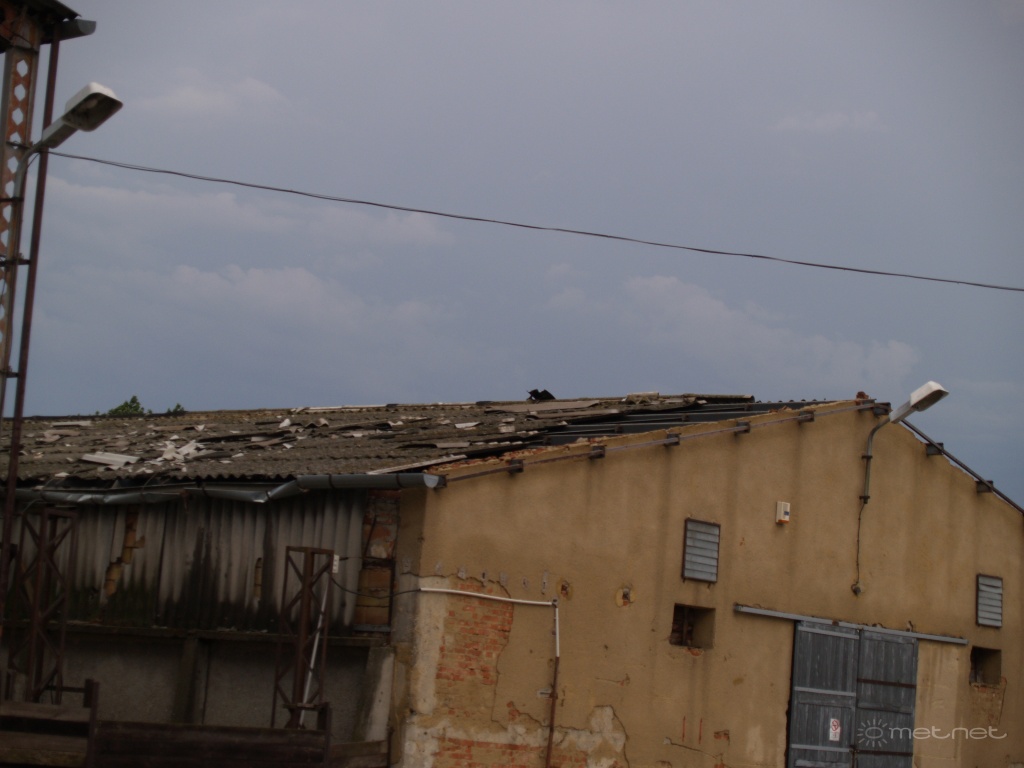 | Leírás: A temetõ szomszédságában lévõ terményszárító oldalát és a mellette álló magtár tetejét is megkezdte a szél! | |