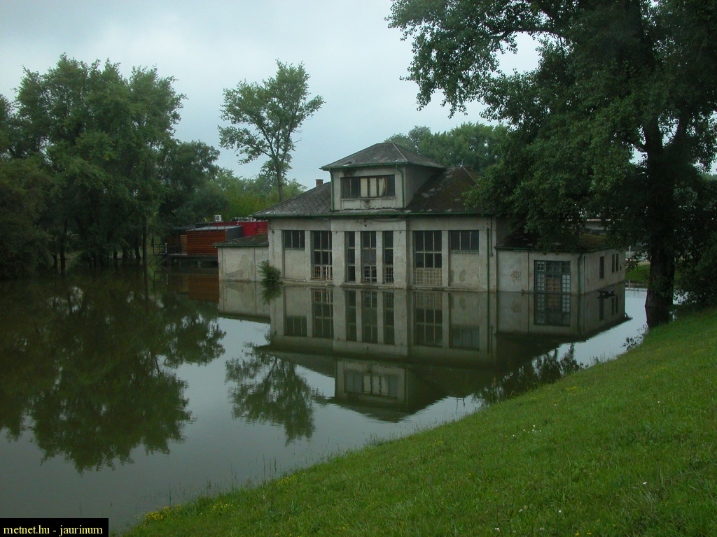 | Leírás: A Rába Gyõrnél. Víz alatt az egykori korcsolyapálya ("Práter") elhagyott épülete | |